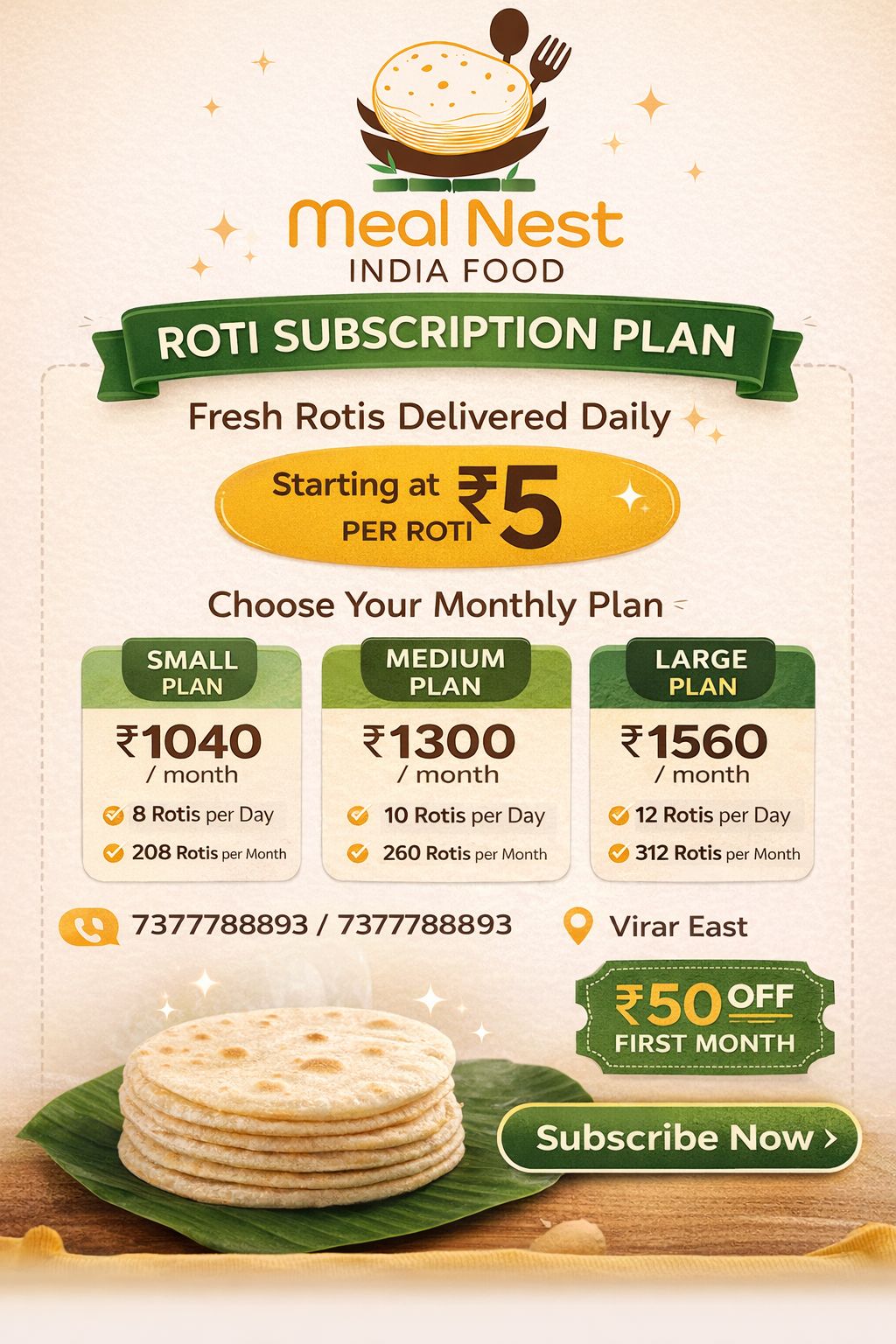 MealNestIndia began with a simple idea: bring everyday, home-style Indian meals back to neighbourhood tables. We specialise in handcrafted rotis and bhakris using quality flours — whole wheat, jowar, bajra and multi-millet blends — paired with seasonal dals, sabzis, chutneys and fresh salads.